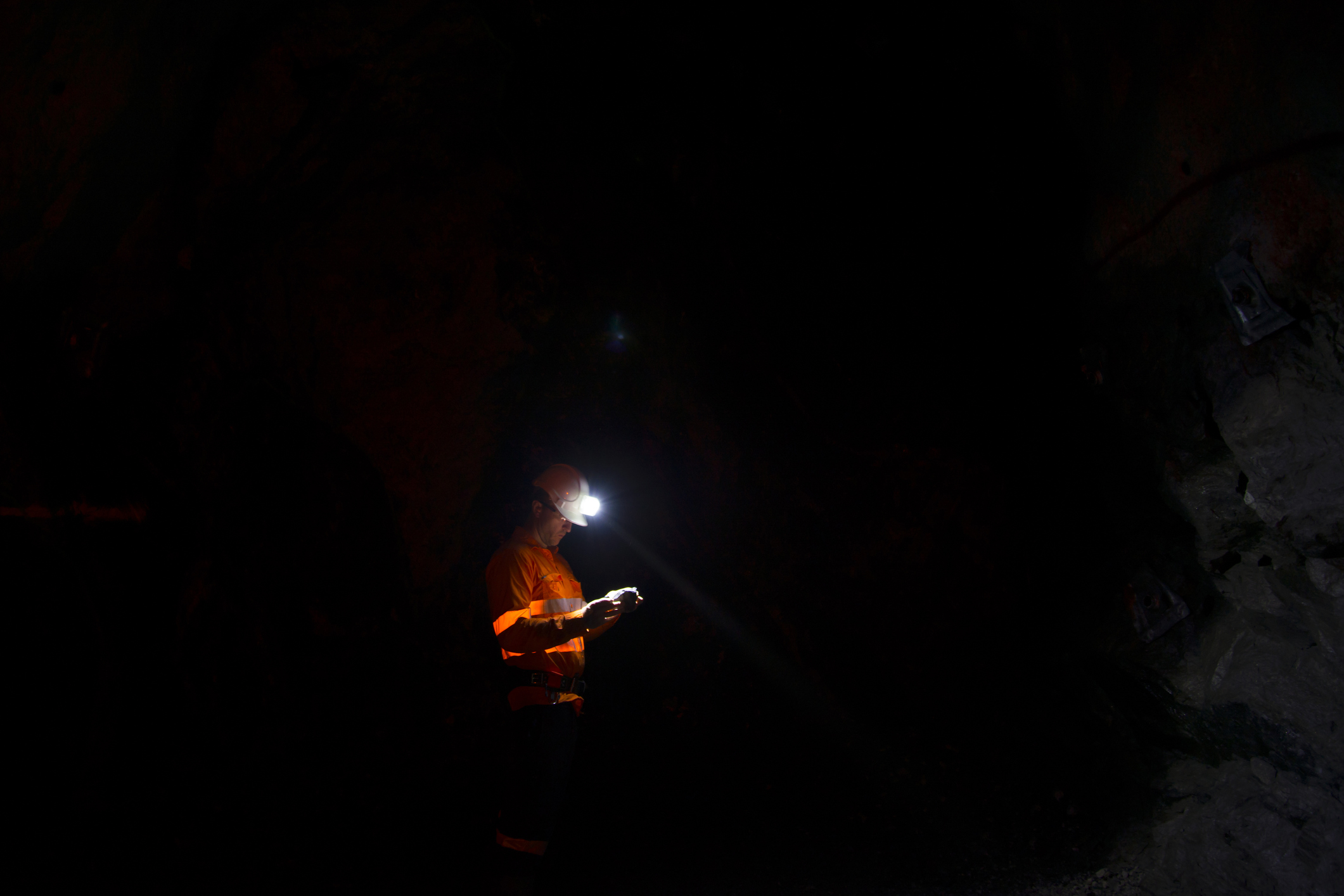 Man With Illuminated Headlamp In Dark Cave